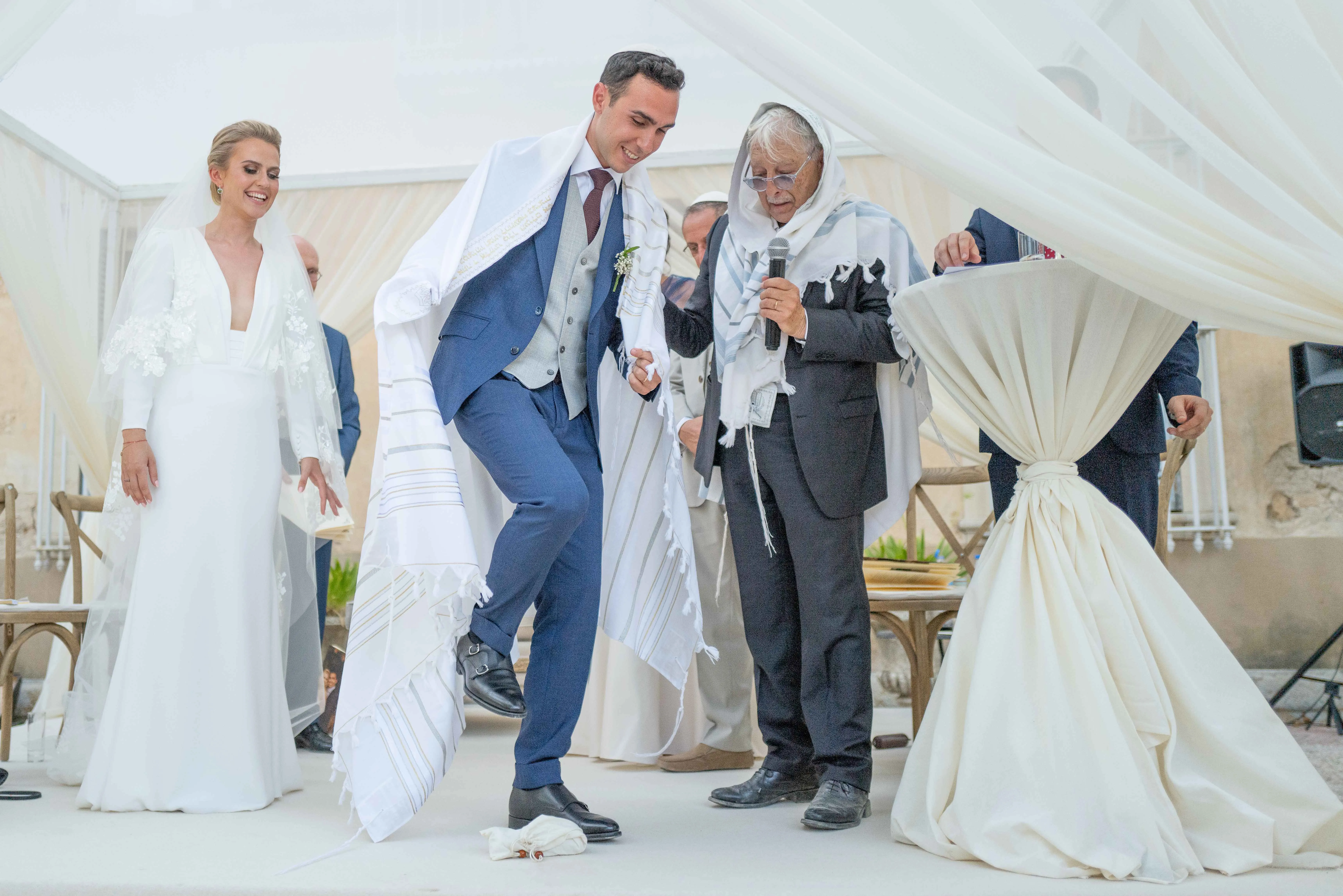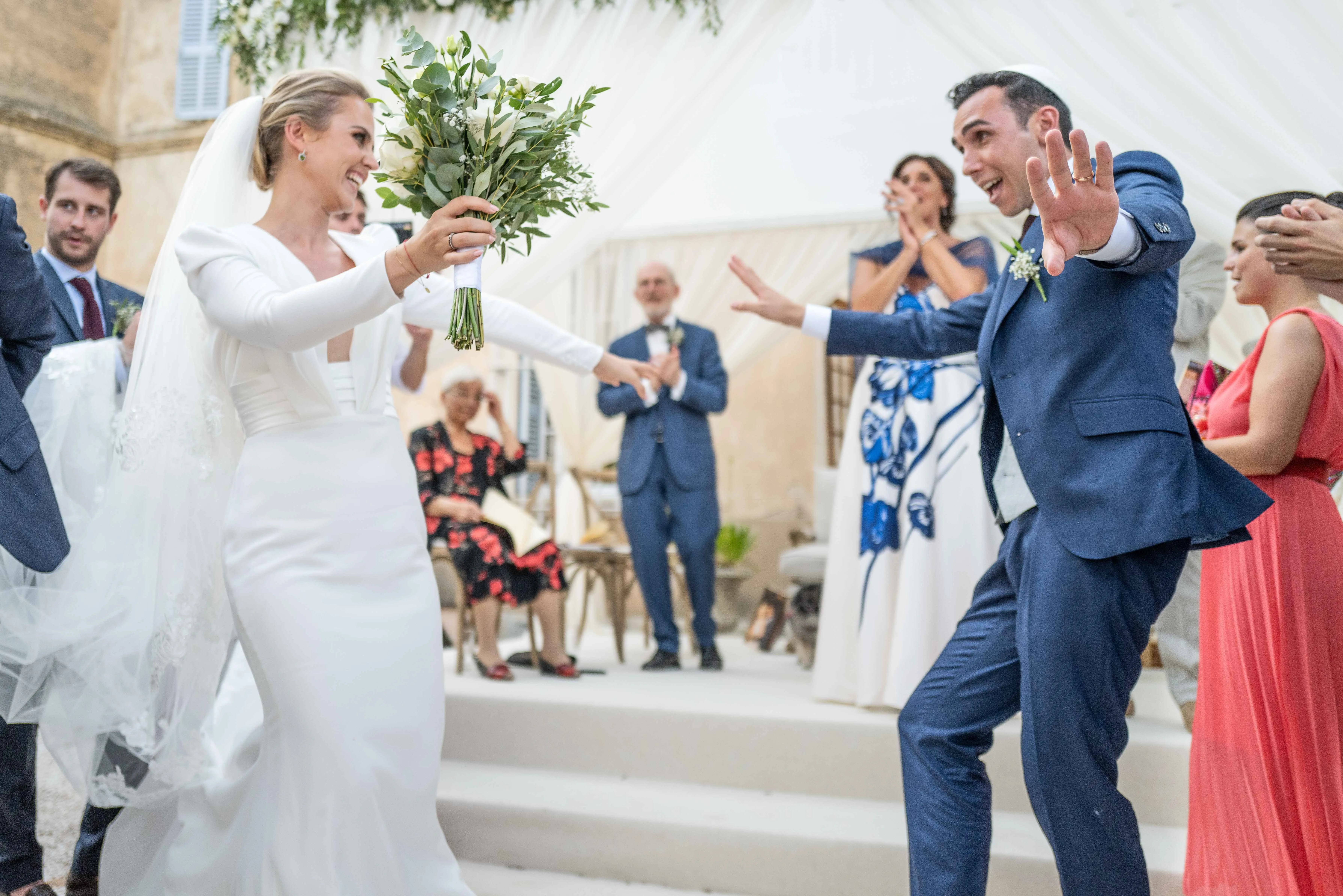 La cérémonie de mariage a été un bel équilibre entre les traditions chrétiennes et juives, reflétant l’héritage culturel diversifié d’Ilan et Anne-Sophie. Les invités ont été témoins de rituels riches en symbolisme et en signification, venant des deux côtés de la famille. La châsse nuptiale a été ornée d’éléments représentant à la fois la croix chrétienne et l’étoile de David juive, soulignant l’harmonie et l’unité entre les deux religions.